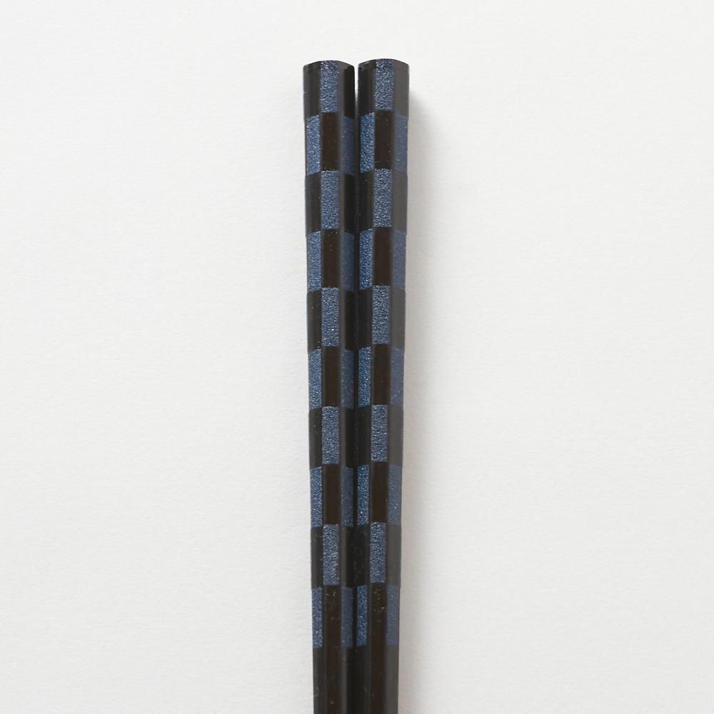 市松模様の色の部分は乾漆のザラザラとした手触りがあります。持ち手は八角、箸先は四角に削った先角という形状になっております。